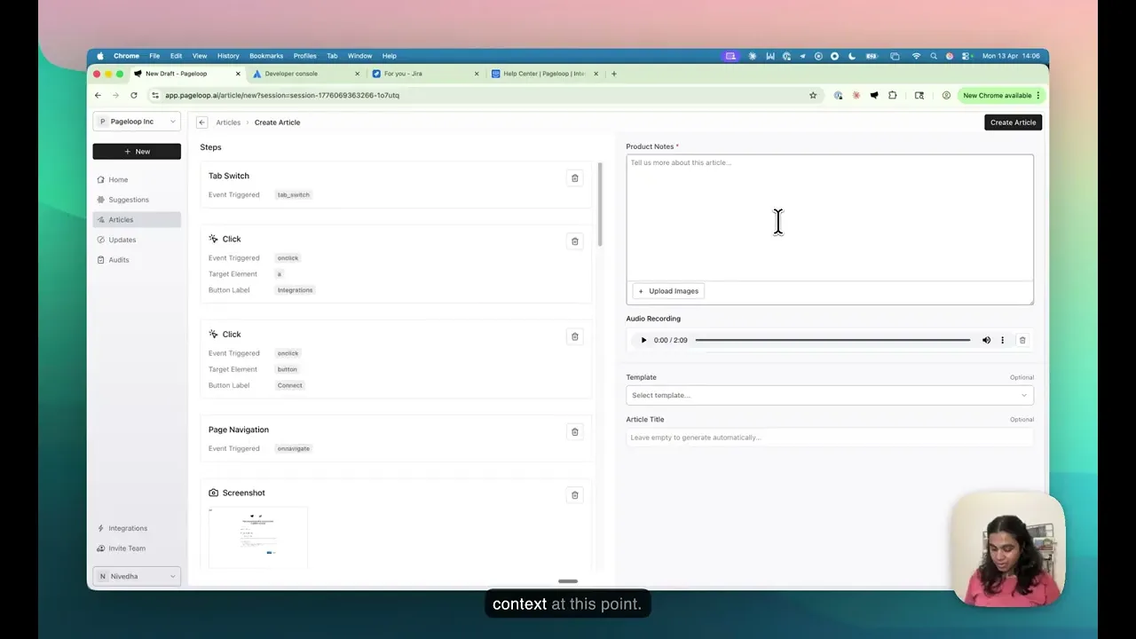 Pageloop is built for the gap between those two experiences. Nivedha recorded a full walkthrough of article creation, from the first click to a published article.