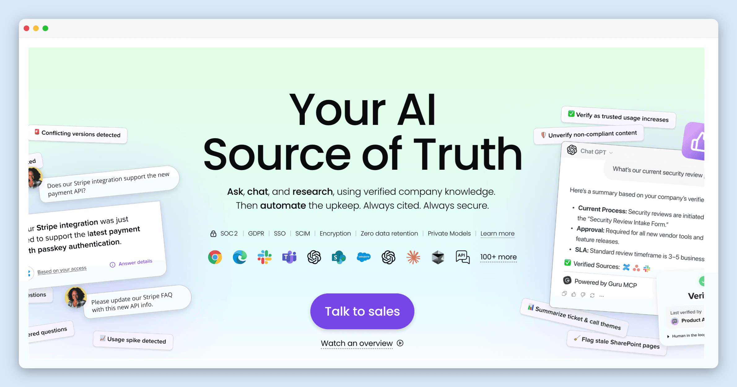 Guru's standout feature is automated knowledge quality which is synced to the company’s knowledge. Knowledge Agents continuously evaluate your content and automatically un-verify anything that looks outdated, deprioritizing it in search and chat until someone confirms it's still accurate. Cards that are actively used and clearly current get verified automatically. You get an audit trail for every decision and can override it if needed.